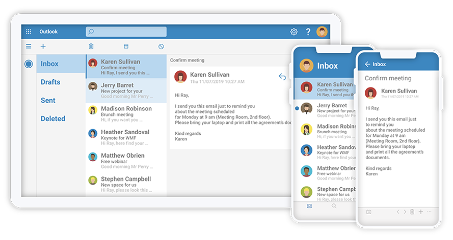 100% compatible con todos tus dispositivos a través de los estándares POP3, IMAP Y SMTP, además de su soporte nativo para MS Outlook con Exchange Active Sync.